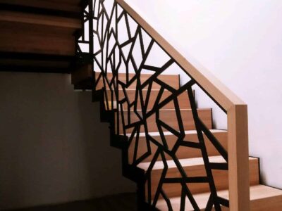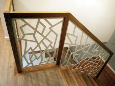 Balustrady wypalane laserowo wykonane są z blachy stalowej malowanej proszkowo. Architektura ażurów pozwala na uwolnienie fantazji, gdyż formy geometryczne, które można wykorzystać są praktycznie nieograniczone. Balustrady te wykonujemy najczęściej w połączeniu z ramą drewnianą.